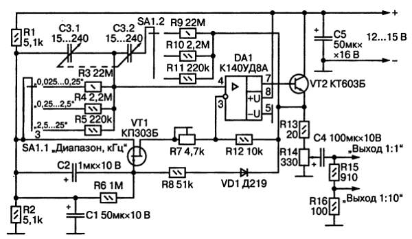 С части нагрузки эмиттерного повторителя, переменного резистора R14 снимается выходной сигнал генератора и через разделительный конденсатор С4, отделяющий постоянную составляющую напряжения, поступает на клемму «Выход 1:1». Резисторы R15 и R16 образуют декадный выходной делитель для получения сигнала на клемме «Выход 1:10» уровнем в 10 раз меньшим, чем на основном выходе.