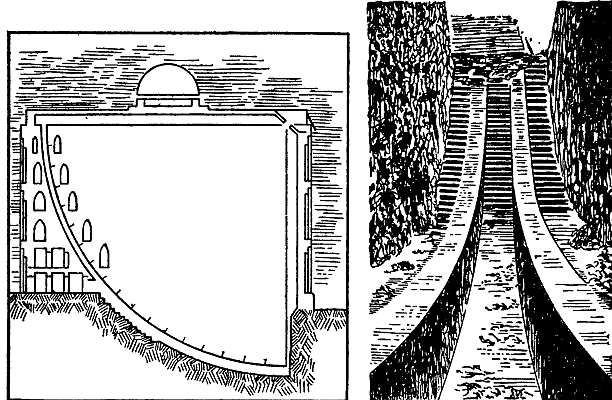 Даже у нас, привыкших к огромным размерам современных технических сооружений, секстант Улугбека вызывает изумление (рис. 9). Дуга секстанта имеет радиус 40,2 м. В ее центре в верхней части здания был укреплен основной диоптр. По самой дуге секстанта на специальных бронзовых рельсах наблюдатель передвигал визирные инструменты, с помощью которых фиксировалось направление на небесное светило. При наблюдениях Солнца помещение секстанта полностью затемнялось, превращаясь, таким образом, в огромную камеру-обскуру. Луч Солнца, пройдя через основной диоптр, давал «зайчик» на специальном белом диске, перемещавшемся по дуге секстанта. По положению тележки с этим диском измерялась полуденная высота Солнца.