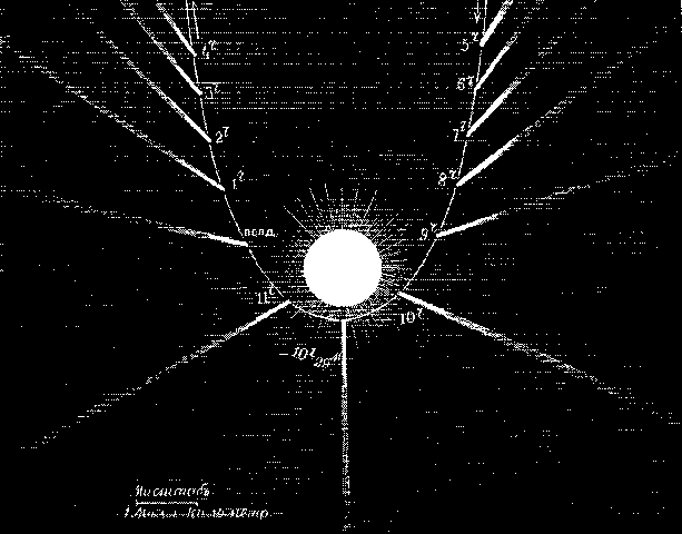 К задаче 5.97. Прохождение кометы 1843 г. вблизи Солнца 27 февраля. Вдоль траектории указано среднее парижское время.