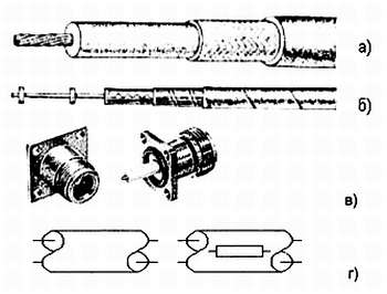 а — с многопроволочным внутренним проводником и сплошной изоляцией; б — с однопроволочным внутренним проводником и изоляцией из диэлектрических шайб; в — ВЧ-разъем; г — компоненты EWB (линии передачи без потерь и с потерями)