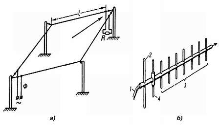 а — ромбическая (l — сторона ромба; Ф — фидер, соединяющий антенну с передатчиком или приемником: R — резистор);б — типа «волновой канал» (1 — кабель питания; 2 — рефлектор; 3 — директоры; 4 — активные вибраторы). Стрелкой показано направление максимальной интенсивности излучения/приема