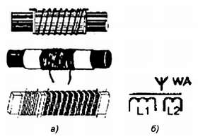 В качестве фидера в телевизионных антеннах (а также в ряде других случаев) используют коаксиальный кабель. Коаксиальный ВЧ-кабель (рис. 28, а) состоит из центрального многопроволочного медного проводника, окруженного толстой полиэтиленовой оболочкой, одетой в медную оплетку, поверх которой имеется защитная полиэтиленовая оболочка. Внутренний проводник может быть также однопроволочным с изоляцией в виде диэлектрических шайб (рис. 28, б).