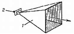 1 — рупор; 2 — питающий радиоволновод. (Направление максимального излучения показано стрелкой)