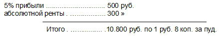 Стоимость товара распадается, как известно, на стоимость постоянного и переменного капитала и прибавочную стоимость. Цена, соответственно этому, должна разлагаться на средние издержки производства, среднюю прибыль и среднюю ренту (ибо общая сумма ренты и прибыли равна общей сумме прибавочной стоимости). У нас же цена разлагается иначе: вместо средних издержек производства взяты издержки производства на худшем, наименее удобном для данного рода предприятий участке земли, а вместо средней ренты взята абсолютная. Но нетрудно видеть, что насколько издержки на худшей земле больше издержек на средней, настолько абсолютная рента меньше средней, в которую, кроме абсолютной, входит еще средняя дифференциальная рента. Таким образом, две формулы цены между собою совершенно тождественны. Проверим это на нашем числовом примере, считая второй участок за средний.