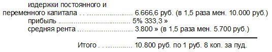 Дело в том, что при расчете для среднего участка издержек берется на З.ЗЗЗ,3 руб. меньше, прибыли на 166,6 руб. меньше, даже абсолютной ренты на 100 руб. меньше (200 руб. вместо 300 руб., потому что участок берется в 1,5 раза меньше), но зато в цену входит отсутствующая для худших участков средняя дифференциальная рента — 3.600 руб., и результат получается один и тот же (3.333,3 + 166,6 + 100 — 3.600 = 0).