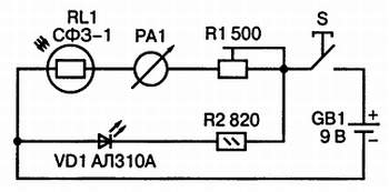 Светодиод VD1 и фоторезистор RL1 образуют датчик, предназначенный для погружения в воду на дно, который тремя проводами соединяется с остальными элементами схемы. В зависимости от глубины погружения увеличивается давление воды на чувствительный элемент датчика и уменьшается освещенность фоторезистора, что регистрируется стрелочным прибором РА1. Конструкция датчика приведена на рис. 25.