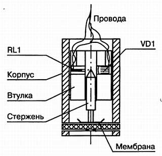 Корпус датчика выполнен из металлической трубки. Нижний торец закрыт мембраной из резины с тканевой прослойкой толщиной 3–4 мм. В центре мембраны крепится стержень круглого сечения диаметром 5 мм с коническим концом, который входит в отверстие втулки. Перпендикулярно оси втулки в ней просверлено сквозное отверстие диаметром 4,85 мм, в котором с одной стороны помещен светодиод, а с другой — фоторезистор. Три провода марки МГТФ-0,35 выходят из корпуса через верхнюю заглушку и обмотаны липкой лентой.