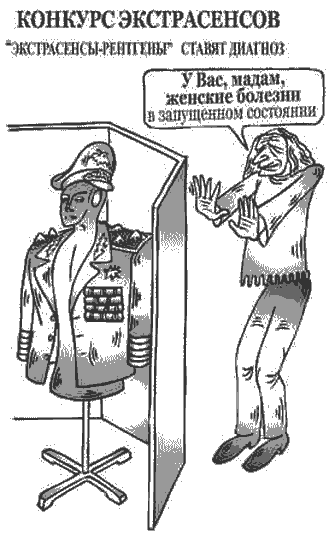 Мастер экстракласса в области психологических опытов Юрий Горный собрал в Москве множество экстрасенсов, объявив, что победитель получит внушительный приз. Одно из заданий было связано с постановкой диагноза больным людям. Поскольку экстрасенсы видят больного насквозь, они вполне могли поставить диагноз человеку, находящемуся за ширмой. Ни одного правильного диагноза поставлено не было. А вот курьез случился. У манекена в генеральской форме были обнаружены женские болезни… Так никто приз и не получил. Зачем я это рассказываю? После окончания конкурса Ю. Горный предложил телевидению полную видеозапись всего этого шоу. Телеканалы все как один отказались показать позор экстрасенсов. Вам не кажется, что независимые СМИ используют своеобразную цензуру в своих коммерческих интересах?