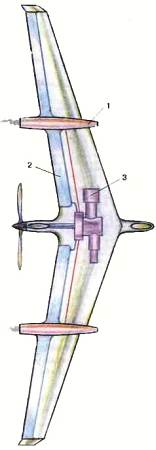 Впрочем, стоит ли гнаться за малым весом? За 70 часов полета на единицу мощности придется сжечь 70 x 0,38 кг = 26,6 кг топлива. По этой цифре можно представить себе стартовый вес и кое-какие размеры предполагаемой модели. Итак, вес 54 кг. Площадь крыла, исходя из нагрузки на единицу площади по нормам ФАИ 120 кг на м2, равна 0,45 м2. При размахе крыльев два метра получается крыло с хордой (шириной) 225 мм.