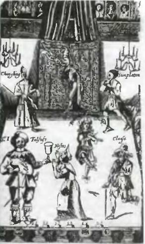 Старинная гравюра с изображением театра XVII века. На переднем плане — персонажи Шекспира — Фальстаф и госпожа Куикли.