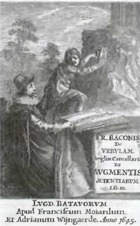 Титульный лист к сочинению Бэкона «О достоинстве и преумножении наук». Книга вышла в 1623году в Лондоне одновременно с Первым Фолио Шекспира. На листе — Бэкон, подталкивающий левой рукой к храму Аполлона Драматурга, Поэта.
