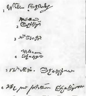 По наиболее распространенному мнению, эти подписи принадлежат руке Шакспера. И это единственное свидетельство его литературных занятий