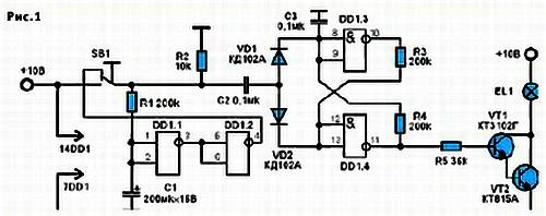 Наш автомат учитывает и подобный момент поведения человека. Означенную выше функцию выполняет реле времени на элементах DD1.2. Реле запускается одновременно с зажиганием света — примерно через 10 секунд, если дверь не закрыта. На выходе ячейки DD1.2 появляется сигнал высокого уровня, который начинает «дежурить» на открытом верхнем контакте SB1. Поэтому закрытая наконец дверь замкнет верхний контакт SB1 и даст триггеру импульс на выключение света. Если же дверь была закрыта при входе, реле времени не успевает сработать и возвращается в «нулевое» положение.