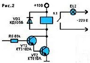 Если в помещение подведена осветительная сеть с напряжением 220 В и требуется более мощное освещение, в коллекторную цепь транзисторов можно включить электромагнитное реле (К1 на рис. 2).