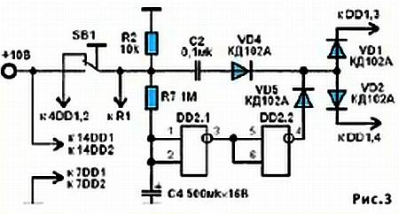 Входящие в реле логические ячейки DD2.1, DD 2.2 принадлежат второй микросхеме DD2. Если две остальные ячейки этой микросхемы не используются, их входы 8, 9, 12, 13 следует заземлить на общий провод схемы.