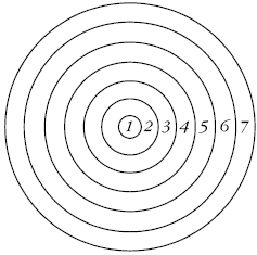 В Германии были заложены основы теории размещения производительных сил. Фактически теория размещения производства начинается с публикации книги «Изолированное государство в его отношении к сельскому хозяйству и национальной экономии», написанной Иоганном Генрихом фон Гюненом (1783–1850) в 1826 г. Главная цель этого фундаментального труда – выявление закономерностей размещения сельскохозяйственного производства относительно рынка сбыта и величины транспортных затрат. Тюнен сконструировал модель оптимального размещения сельскохозяйственного производства в форме шести функциональных колец вокруг рыночного центра (рис. 2.1).