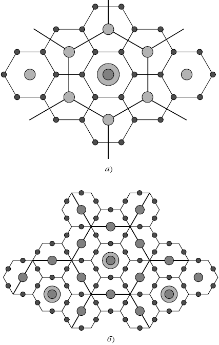 Рис. 2.3. Варианты размещения «центральных мест» (по В. Кристаллеру): а – центры обслуживания находятся в узлах решетки; б – центры обслуживания находятся на ребрах решетки