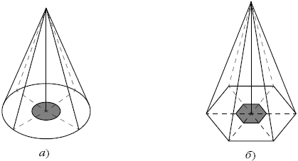 Рис. 2.4. Модель пространственной организации хозяйства в зависимости от рынка сбыта, транспортных издержек и расселения населения (по А. Лёшу): а – «конус спроса» с круглым основанием; б – «конус спроса» с шестиугольным основанием