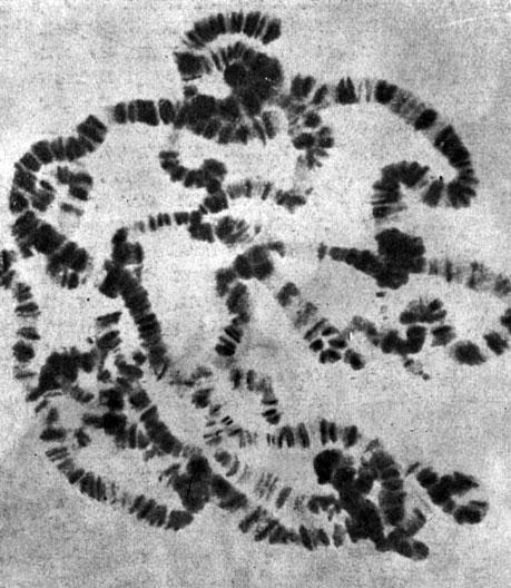 Таблица IV. Покоящееся ядро клетки слюнной железы мушки Drosophila melanogaster. Гены прошли восемь циклов удвоения и поэтому выглядят как серии поперечных полосок, из которых каждая содержит 256 генов. Более крупные гены дают сильнее окрашенные полоски (X 1500)