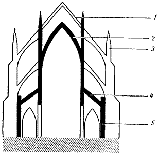 Рис. 8. Типичная конструкция готического собора с контрфорсами. 1 - деревянная крыша; 2 - арочный свод; 3 - контрфорс; 4 - деревянная крыша бокового придела; 5 - стена придела.