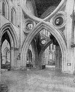 В соборе св. Софии эта задача решалась и рациональнее и успешнее: там вспомогательные купола давили на главный купол и создавали сжатие в опасной области. Однако иногда готические зодчие перебарщивали: создавая слишком большие боковые давления, они должны были ставить подпорки изнутри, чтобы предотвратить разрушение крыш. Эти подпорки чаще всего делались в виде перевернутых арок, подобных аркам собора в Уэлсе (Великобритания), который, как бы ни оценивали его в эстетическом плане, технически построен неграмотно (рис. 9). Не удивительно, что крыши церквей довольно часто рушились на головы коленопреклоненных прихожан.