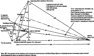 До сих пор мы не установили местоположения храмового объекта в Бишопс-Каннингсе, находящегося на западном краю западного круга. Объект находится на од ной линии с курганом Вест-Кеннеттом и центрами обоих кругов. Он также может быть соединен с помошью репера с Силбери-Хиллом. Компьютер дает для Силбери-Хилла к Бишопс-Каннингсу угол чуть больше 83° и, следовательно, угол чуть меньше 7° для Бишопс-Каниингса. Эти углы легче всего произвести, разделив пополам угол в 14°, который является производным от отношения 4:1 (см. Приложение 3). Это лишний раз показывает, что Силбери-Хилл является исходным объектом в размещении всех ключевых мест в комплексе Марлборо-Даунс.
