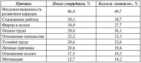 Для организации необходимость адаптации связана с намерением, во-первых, снизить прямые и косвенные издержки, сопряженные с наймом. К ним относятся, по Фаулеру, затраты на найм нового работника на место уволившегося, вводные затраты (обучение и т. д.), затраты на временное замещение, на дополнительный контроль и исправление ошибок и др. Эти затраты могут составлять до 75 % годовой оплаты его труда. По мнению М. Армстронга, первое впечатление от компании, которое можно условно обозначить первым месяцем работы, очень важно для поддержания интереса к ней нового сотрудника. Если уделить больше внимания введению работника, это, как правило, окупается.[128] В противном случае возникает вероятность того, что новый работник покинет организацию, не адаптировавшись к работе в ней. Согласно исследованию М.-Л. Рейн,[129] покинуть свое рабочее место в скором времени собираются 1/5 (17 %) «новичков» и 2/5 (40 %) их коллег. Основной причиной увольнений и перехода на другое место работы (табл. 5.30) являются неудовлетворенность развитием карьеры (почти 50 % опрошенных), содержанием работы (около 40 %) и «размер заработной платы» (33 %).