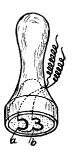 Для клеймения на дереве, коже и тому подобных материалах и для постановки печати на бумаге можете устроить себе электрический штемпель. Для этого пользуются накаливанием током тонкой (0,5 мм диаметром) круппиновой или нейзильберовой проволоки, изогнутой в виде тавра (метки) или буквы в одной плоскости без пересечения линий. Конечные точки изогнутой проволоки а и b (рис. 27) загибаются перпендикулярно и спаиваются с разноименными концами двойного гибкого провода с штепселем на другом конце. Провода вводятся в рукоятку штепселя, высверленную подобно рукоятке электрического выжигателя, а изогнутая проволока располагается внутри печати, углубление которой заливается гипсом.