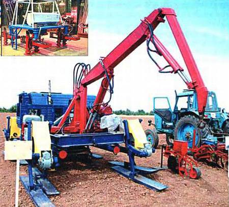 Шагоход с погрузчиком на поле. Вверху: в Волгограде ведется разработка нового отечественного шагохода.
