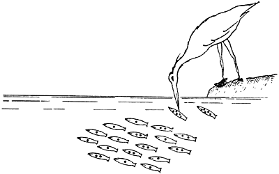 Рис. 6. Эта схема поясняет, почему рыбы, содержащие больше метилртути, имеют больше шансов стать жертвой птиц. Число черных точек соответствует количеству ртути в организме рыбы. У рыб, содержащих наибольшее количество ртути, нарушена координация движений при плавании, и они отстают от косяка. Уже одно это, не говоря о других нарушениях двигательных функций, облегчает задачу птицы.