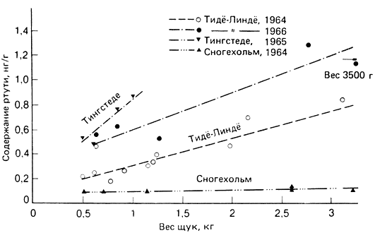 Рис. 9. Содержание ртути в осевой мускулатуре щук из различных водоемов Швеции в сопоставлении с весом тела. Чем выше начальная точка, тем круче поднимается кривая, т.е. тем быстрее идет дальнейшее накопление ртути (по Johnes et al., из Eichler, 1972)