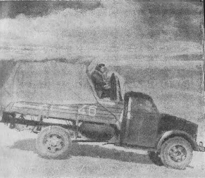 Последние городские строения остались позади, грузовик катит по степному бездорожью. Направо и налево простираются небольшие холмы с пологими, покрытыми травой склонами. Ветер усиливается, небо хмурое. Вскоре убеждаемся, что сидеть в грузовике нельзя. Машина подпрыгивает на каждой кочке. Вместе с ней подпрыгиваем и мы, а затем шлепаемся на жесткую скамью. Откидываем брезент и встаем на ноги: колени пружинят куда лучше рессор. Если бы я знал, что предстоит вот так стоя покрыть большую часть пути в 6 тысяч километров, вряд ли мое настроение было бы таким приподнятым. Степной ветер пригоршнями бросает мне в лицо песок — и я вдруг понял, почему у монголов узкий разрез глаз.