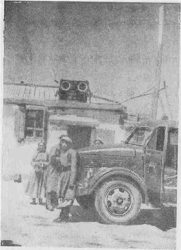 Вдали появляется нечто напоминающее дом на колесах. Мы строим догадки, что бы это могло быть? Позднее ото станет для нас своего рода игрой: кто первый догадается, какой новый сюрприз ожидает нас. На горизонте один за другим возникают таинственные силуэты. Медленно и бесшумно надвигавшийся на нас по степному тракту дом производил загадочное впечатление. Вскоре мы обнаружили рядом с ним всадника. Вандуй своими зоркими глазами первый рассмотрел, что это не дом, а два совсем новеньких советских комбайна, выпущенных в 1957 году. Вокруг, куда ни кинешь взгляд, пастбища и пески. Комбайны спешат в ближайший госхоз. Комбайнер горделиво, как монгольский хан, возвышается на своем сиденье.