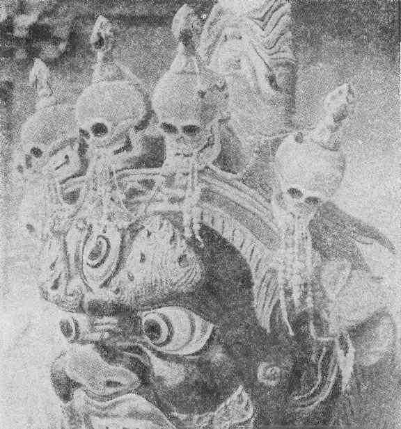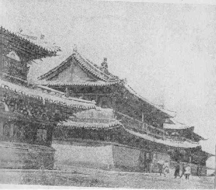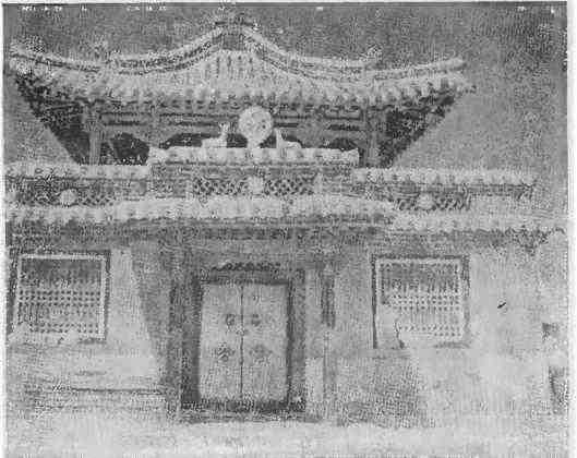 Поднимается такой сильный ветер, что наш грузовик с трудом продвигается вперед. Затрачиваем полтора часа, чтобы добраться до берега Орхона, следуя теперь не той дорогой, что накануне. В середине огромной, широко раскинувшейся долины чернеет обширный массив распаханных земель. Наша машина пожирает километр за километром, и вот мы уже различаем вдали множество маленьких белых предметов. Перед нами белая четырехугольная крепостная стена, а на ней на расстоянии восьми-десяти метров друг от друга маленькие пирамидальные субурганы — священные символы буддизма. На каждой стене выстроилось по 20–25 таких пирамидок, а на каждом из четырех выдающихся углов еще по две. Толстые стены обращены к четырем сторонам света; ворота в форме трапеции очень напоминают древнеегипетские. Виднеются изогнутые линии черепичных крыш, расположенных за стенами строений. Из находящейся неподалеку юрты выходит ее хозяин и говорит нам, что стучать надо в восточные ворота. Тяжелые створы открываются: перед нами развалины Эрдени-Цзу, одного из самых древних и почитаемых монгольских монастырей.