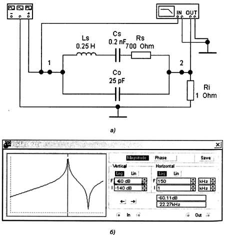 Параметры выбранного резонатора Р соответствуют использованным в предыдущей схеме замещения (см. рис. 117, а), поэтому АЧХ, получаемая на Боде-плоттере, будет идентична показанной на рис. 117, б, и здесь не приводится.