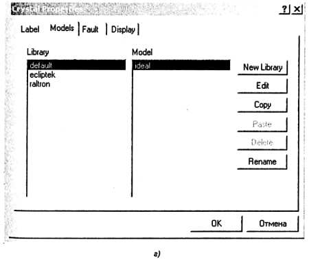 а — схема замещения; б — АЧХ; в — схема исследования модельного компонента; г — окно выбора модели; д — окно редактирования свойств