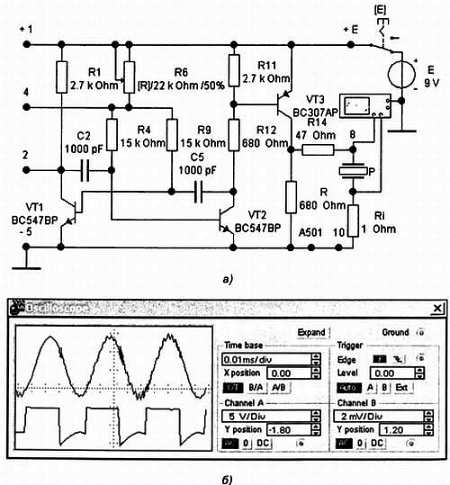 Данный набор содержит основной компонент предлагаемого антикомариного оружия (отпугивателя насекомых-паразитов): генератор электрических высокочастотных колебаний. Схема генератора, выполненная в виде виртуальной модели в программе EWB, показана на рис. 122, а.