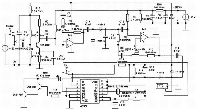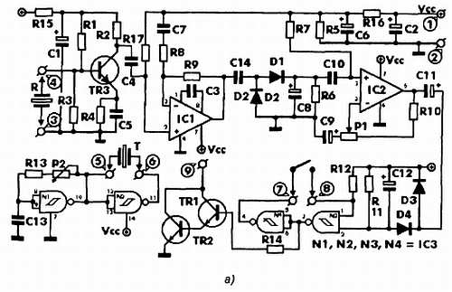 Схема устройства состоит из трех блоков: усилителя на биполярном транзисторе TR3 (типа ВС 547) и двух ОУ IC1 и IC2 (типа 741); логического устройства на двух элементах NAND (N3, N4) и двух биполярных транзисторах TR1, TR2 (также типа ВС 547); автогенератора ультразвуковых электрических колебаний на основе двух элементов NAND (N1, N2) и пьезопреобразователя Т (TRANSMITTER — передатчик), включенного в цепь ОС (выводы 5, 6). Здесь и далее выводы на плате обозначаются в круглых скобках, а на микросхеме без них. Элементы N1-N4, показанные на принципиальной схеме (в стандарте ANSI) в разнесенном виде, входят в состав КМОП микросхемы 4093 (аналог — К561ТЛ1) и представляют собой триггеры Шмитта, на входе каждого из которых стоит двухвходовой элемент NAND, причем они, кроме N4, использованы как инверторы.