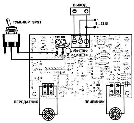 Устройство смонтировано на печатной плате размером 50x88 мм (рис. 119, б). На вход усилителя (выводы (3),(4)) включается пьезоприемник R (RECIEVER — приемник), между выводами (2) и (9), обозначенными на рис. 119, б, как «ВЫХОД», через токоограничивающий резистор R18 = 470 Ом включается светоизлучающий диод (Light Emitting Diode) — LED. Между выводами (7), (8) включается тумблер SPTP, служащий для сброса системы в исходное (сторожевое) состояние после приема сигнала. Потенциометр Р1 служит для регулировки коэффициента усиления принимаемого сигнала, а Р2 — для регулировки рабочей частоты. Питание устройства осуществляется от источника постоянного напряжения 9…12 В, подключаемого к выводам 1, 2 (1 — «плюс», 2 — «земля»).