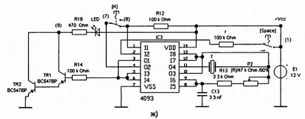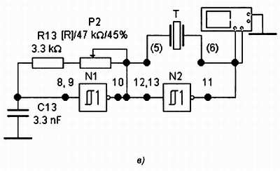 Поэтому соберем последнюю виртуальную модель, воспользовавшись библиотечным компонентом микросхемы 4093, и используем ее и для генератора, и для логического блока, как и предусмотрено в реальном устройстве. Эта модель показана на рис. 119, ж.