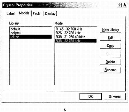 В качестве пьезопреобразователя Т использована библиотечная модель на частоту 32,768 кГц марки R38 (raltron), выбираемая последовательным нажатием ЛKM на пиктограммы и
