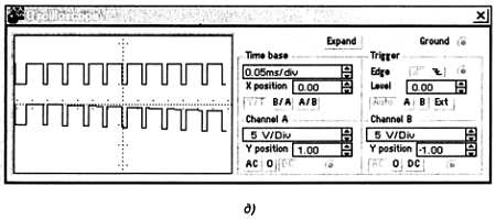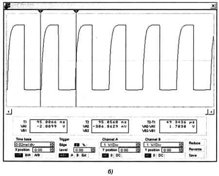 Для исследования работы мультивибратора в схему дополнительно включен также осциллоскоп, фиксирующий форму выходных колебаний напряжения. Осциллограммы можно снимать при различных значениях R6. Для этого надо «открыть» лицевую панель виртуального осциллоскопа и выполнить необходимые установки (см. рис. 122, б). Затем включить моделирование и последовательно нажимать клавишу [R] для регулировки «вниз» и [R] + Shift, соответственно, для регулировки «вверх». При этом надо иметь в виду некоторые особенности работы программы. Во-первых, для регулировок надо щелкнуть предварительно ЛКМ, поместив курсор в любую точку рабочего поля, кроме панели осциллоскопа. Во-вторых, регистр шрифта должен стоять в позиции «Еп», а не «Ru», так как программа канадская. В-третьих, желательно начинать исследования с 50 % (при очень малых значениях R6 генератор не самовозбуждается). Наконец, для получения реалистичной картины колебаний относительная ошибка анализа RELTOL должна быть не более 0,0001.