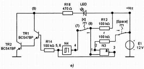 Ультразвуковой пучок, попавший на приемник и далее усиленный, формирует высокий уровень на входе 2 элемента N3. В модели это представлено источником Е1, ключом с управляющей клавишей Space и резистором r = 100 кОм. На вход 1 этого же элемента через резистор R12 также подается высокий уровень, а выход с него (при двух высоких уровнях на входе — низкий уровень) через R14 поступает на транзисторную сборку типа Дарлингтона (TR1,TR2) и далее на светодиод LED. При низком уровне сигнала на выводе 3 светодиод не горит. Ключ К должен замыкать контакты (7) и (8), также поддерживая высокий потенциал точки (8) при низком на 3, 5, 6 и, соответственно, высоком на 4 и (7). Для моделирования прерывания ультразвукового пучка, размыкаем ключ Space: светодиод загорится (на схеме рис. 119, е две стрелки вблизи него, имевшие просвет в своих окончаниях, «зачернятся» ).