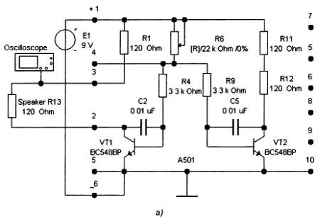 В модели сохранены параметры и позиционные обозначения оригинала. Устройство представляет собой обычный мультивибратор на двух NPN-транзисторах VT1 и VT2 и усилительный каскад на PNP-транзисторе VT3. Регулировка частоты повторения импульсов осуществляется резистором R6. На выход усилителя подключен пьезоизлучатель Р, параметры которого мы выбрали, как и ранее, в соответствии с рис. 117, д. Дополнительно в модель подключен осциллоскоп и «датчик тока» в нагрузке Ri.