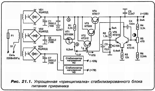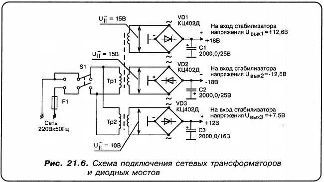 «Н»: Но на принципиальной схеме (рис. 21.6) я вижу нечто ИНОЕ? На входах двух стабилизаторов 18 вольт и на входе третьего — 12 вольт?