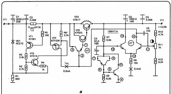 «С»: Во-первых, микросхема здесь использована со смыслом и по причине крайней необходимости! Строго говоря, 198НТ1 — это даже не микросхема, а МИКРОСБОРКА, где на одном кристалле сформированы ПЯТЬ транзисторов. Два из них (по схеме VT11 и VT12) имеют объединенный эмиттер.