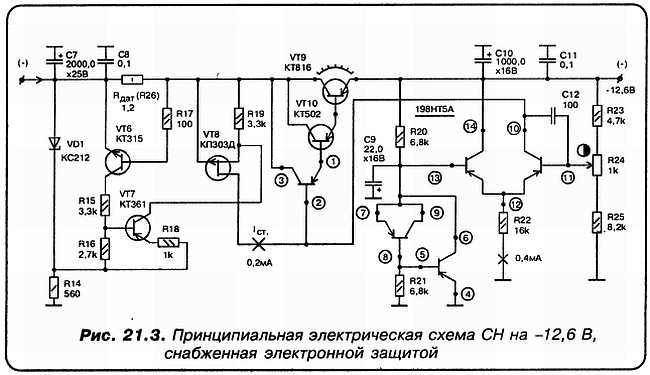 «А»: Я так понимаю, что пока ток нагрузки (рис. 21.2, а) не превышает некоторый максимально допустимый, например 500 мА, падение напряжения на резисторе R13 недостаточно для отпирания VT1. Следовательно, его коллекторный ток можно считать равным нулю. Но в этом случае заперт и VT2. Следовательно, коллекторный ток VT2 так же равен нулю!