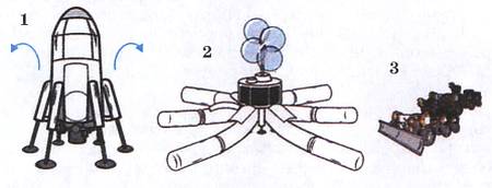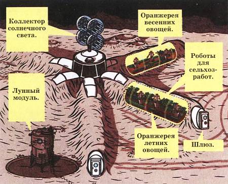 1 — на Луну опускается беспилотный грузовой модуль; 2 — в плотно упакованные рукава подается воздух, и они под давлением разматываются во все стороны; 3 — робот-бульдозер выезжает через один из рукавов наружу и присыпает теплицу лунным грунтом.