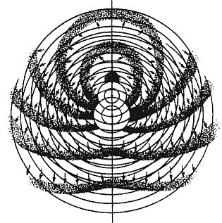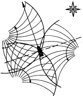Рис. 11. Схема расположения трех групп вращающихся лучей, наблюдавшихся 24 апреля 1953 г. экипажем английского теплохода «Рафаэла». В продолжение 20 минут мимо судна ежесекундно пробегали по 3 светящихся полосы.