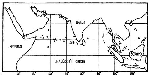 Рис. 13. Карта северной части Индийского океана. Кружками отмечены те места, где наблюдались «взрывающиеся» люминесцирующие сферы, треугольниками — вращающиеся «колеса» и бегущие полосы света